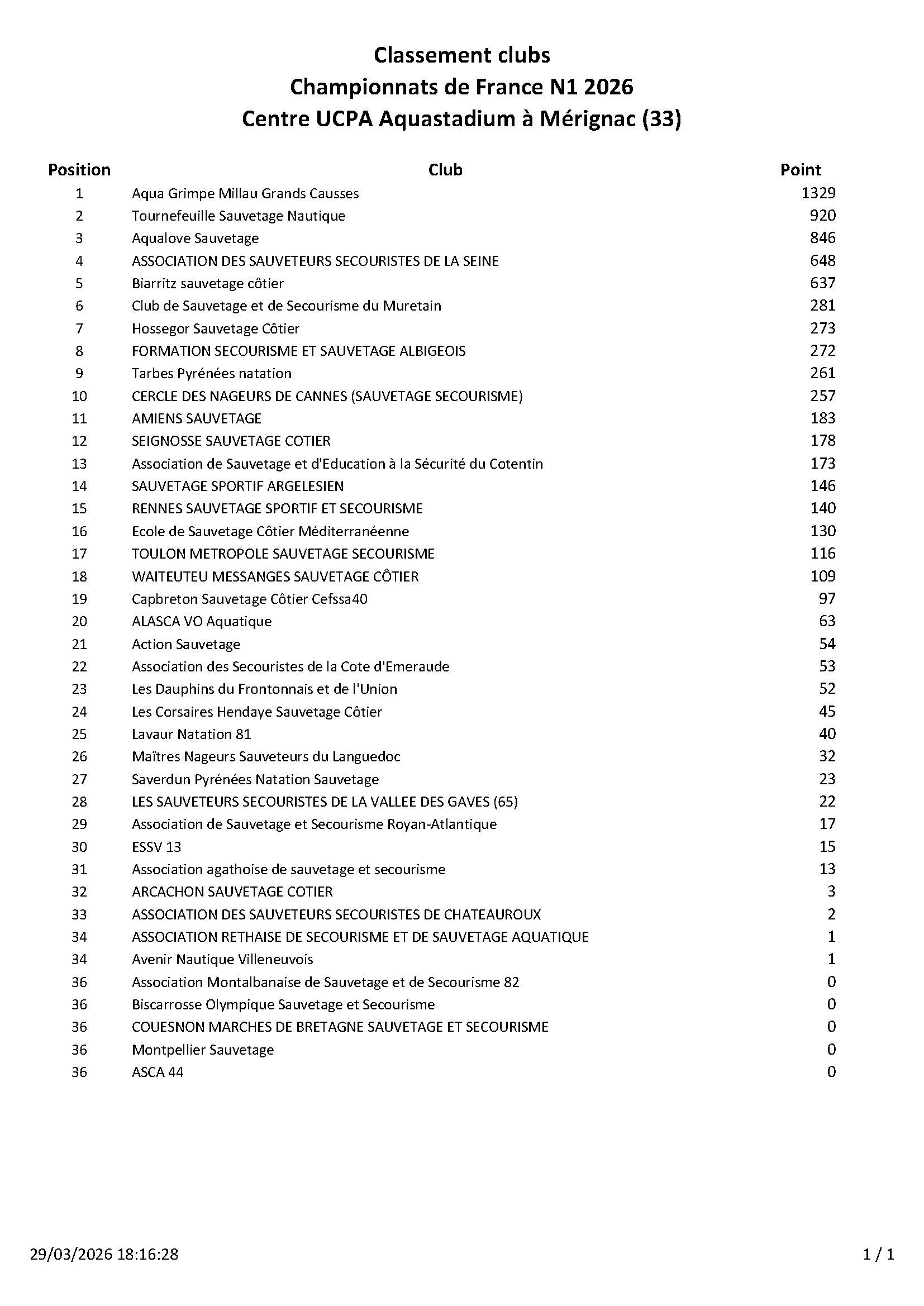 Le week-end du 27 au 29 mars dernier, se sont tenues les Championnats de France Eau Plate N1 de sauvetage sportif. Cette compétition regoupe les 24 meilleurs sauveteurs de France, dans les catégories Cadets, Junior et Séniors, tant chez les femmes que les hommes. Le classement a été effectué grâce aux temps réalisés lors de la saison d’eau plate, c’est-à-dire entre le 1er octobre 2025 et le 16 mars 2026.